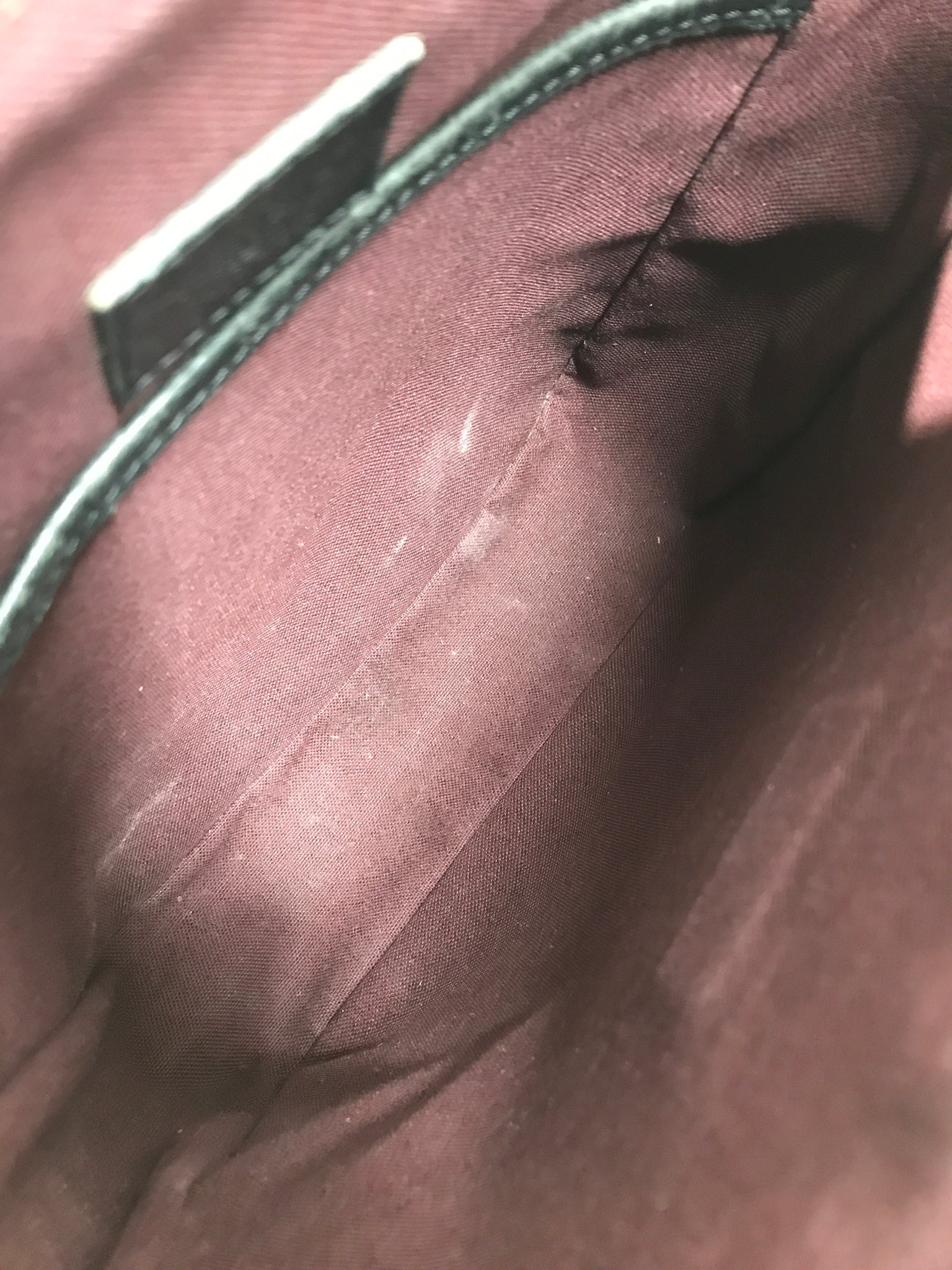 Flapped magnetic closure, adjustable nylon canvas strap, black cowhide leather trim, two interior flat pockets, burgundy textile lining, silver-tone hardware