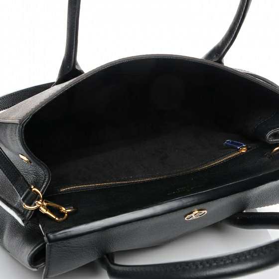Black leather trim, rolled leather top handles, interior zipped and flat pockets, black leather flap closure, two spacious compartments, detachable shoulder strap, black microfiber lining