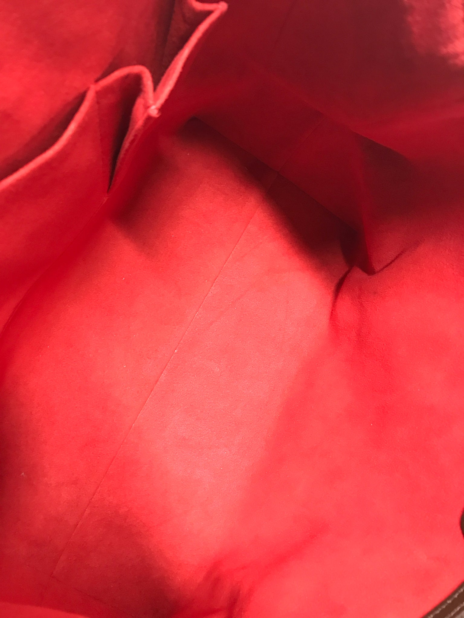 Shiny brass hardware and a Louis Vuitton Inventeur plate on the front