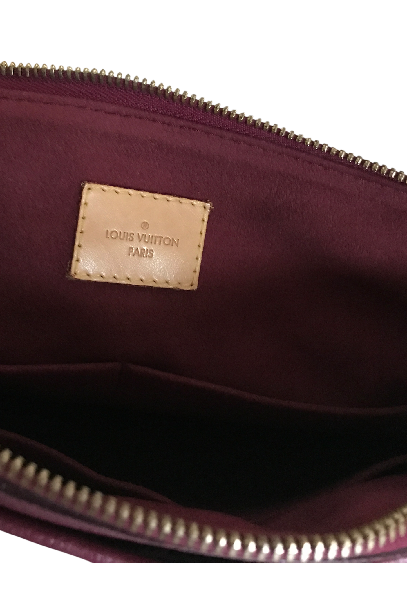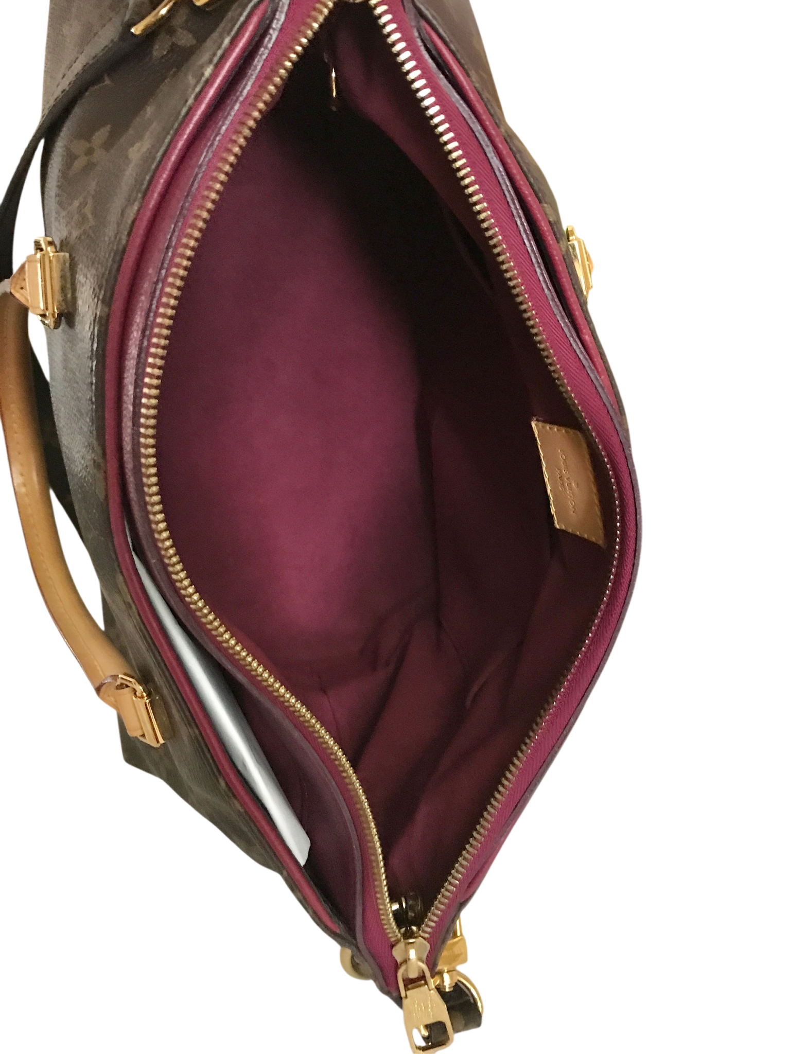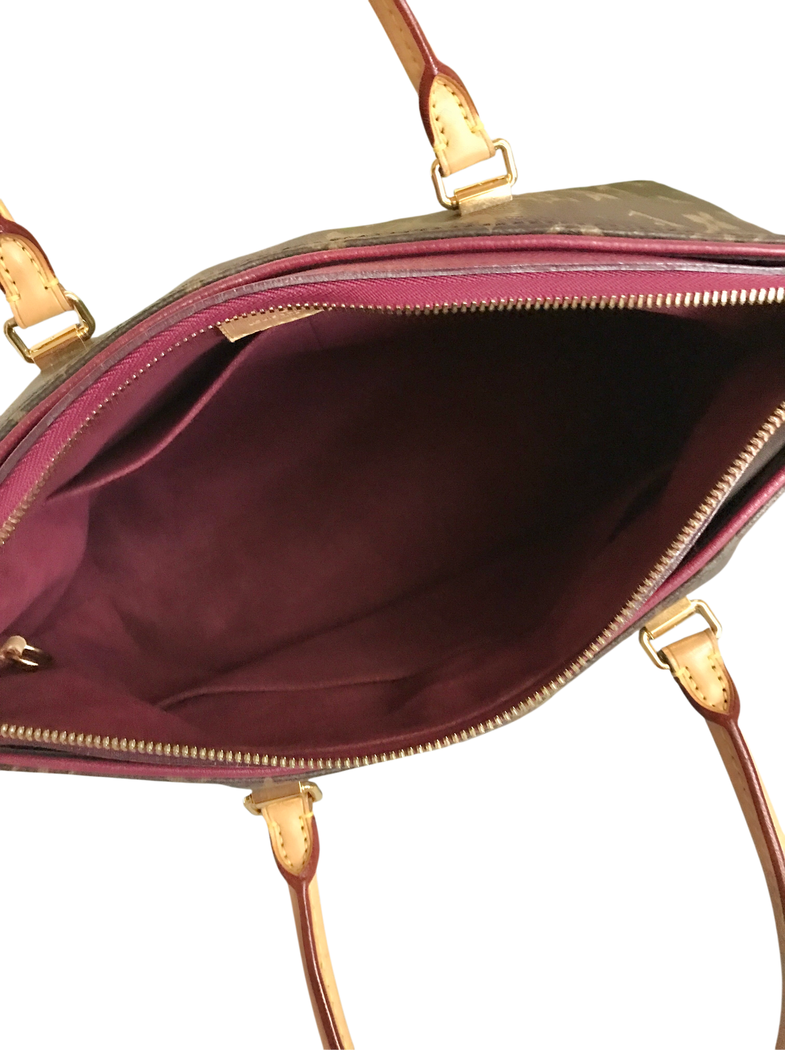 Vachetta leather rolled top handles, deep pockets on the front and back, zip closure, yellow microfiber lining, three interior patch pockets, detachable monogram canvas strap