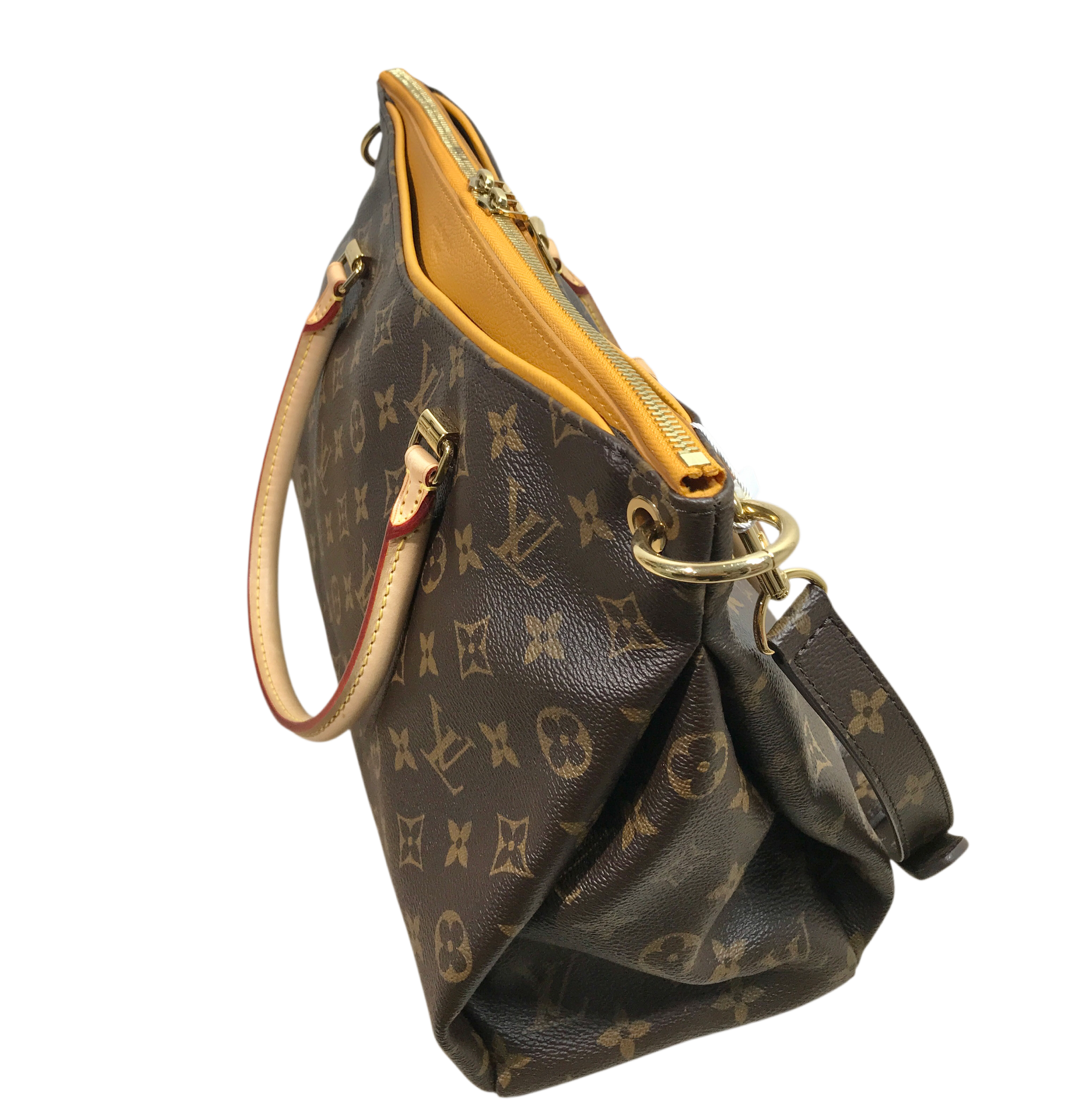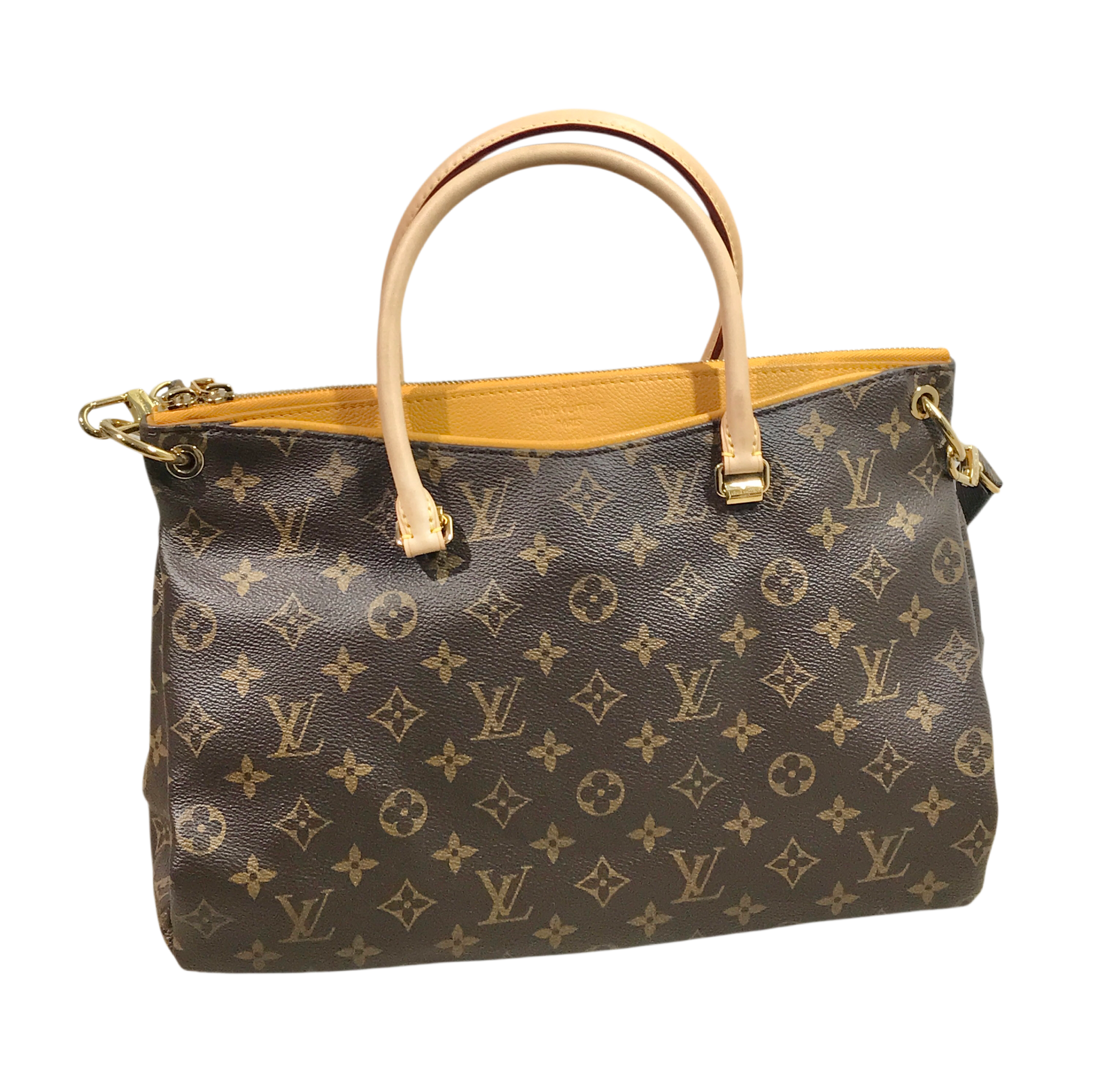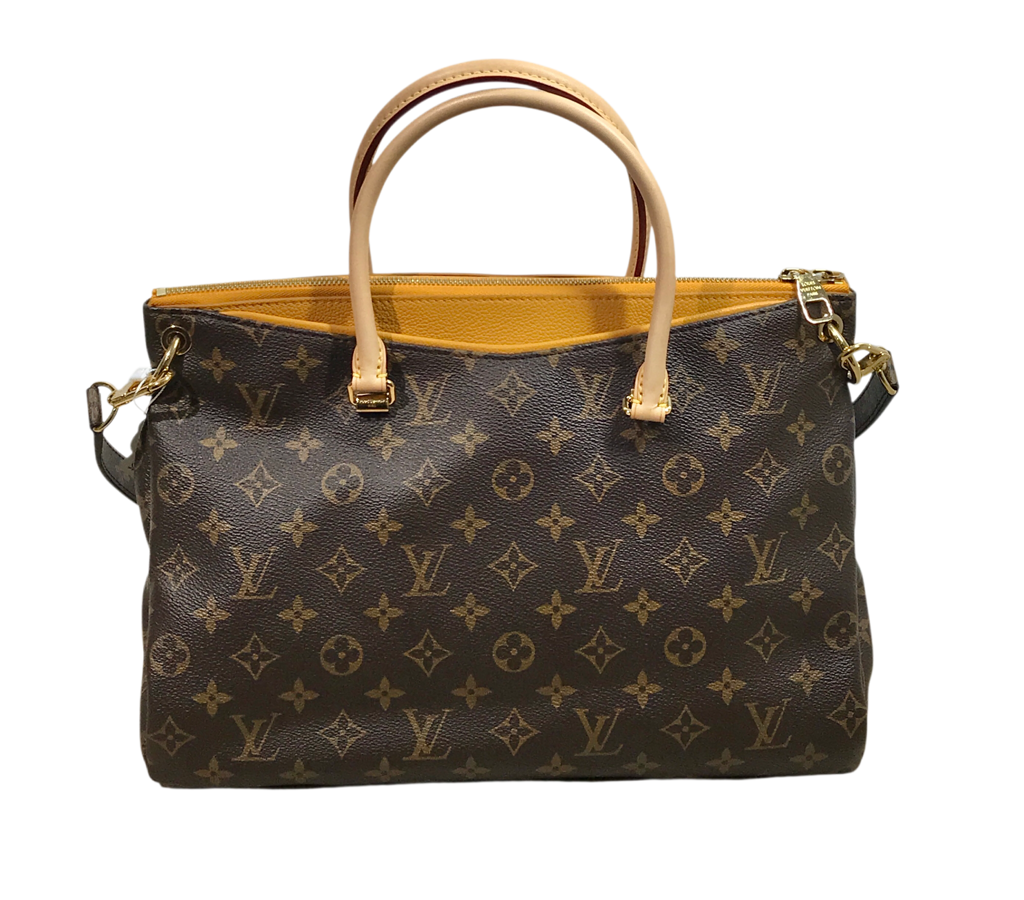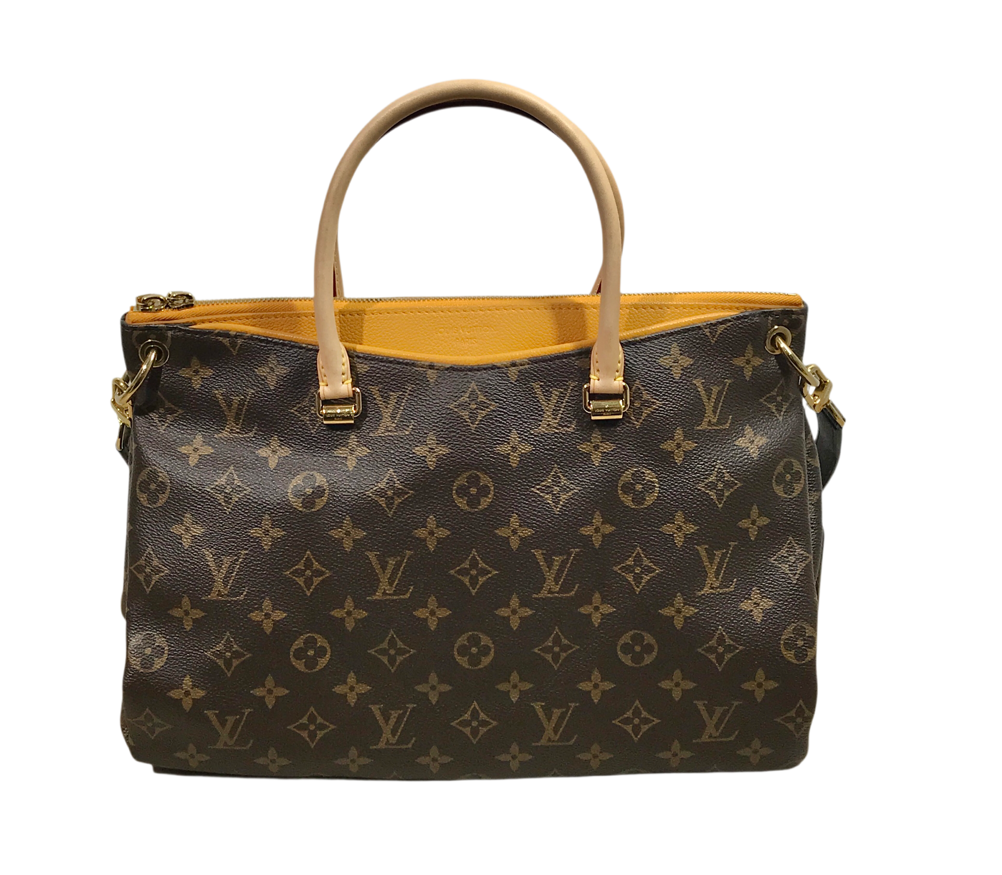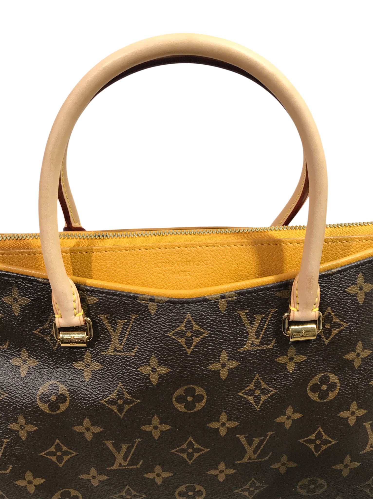 Vachetta leather rolled top handles, deep pockets on the front and back, zip closure, yellow microfiber lining, three interior patch pockets, detachable monogram canvas strap