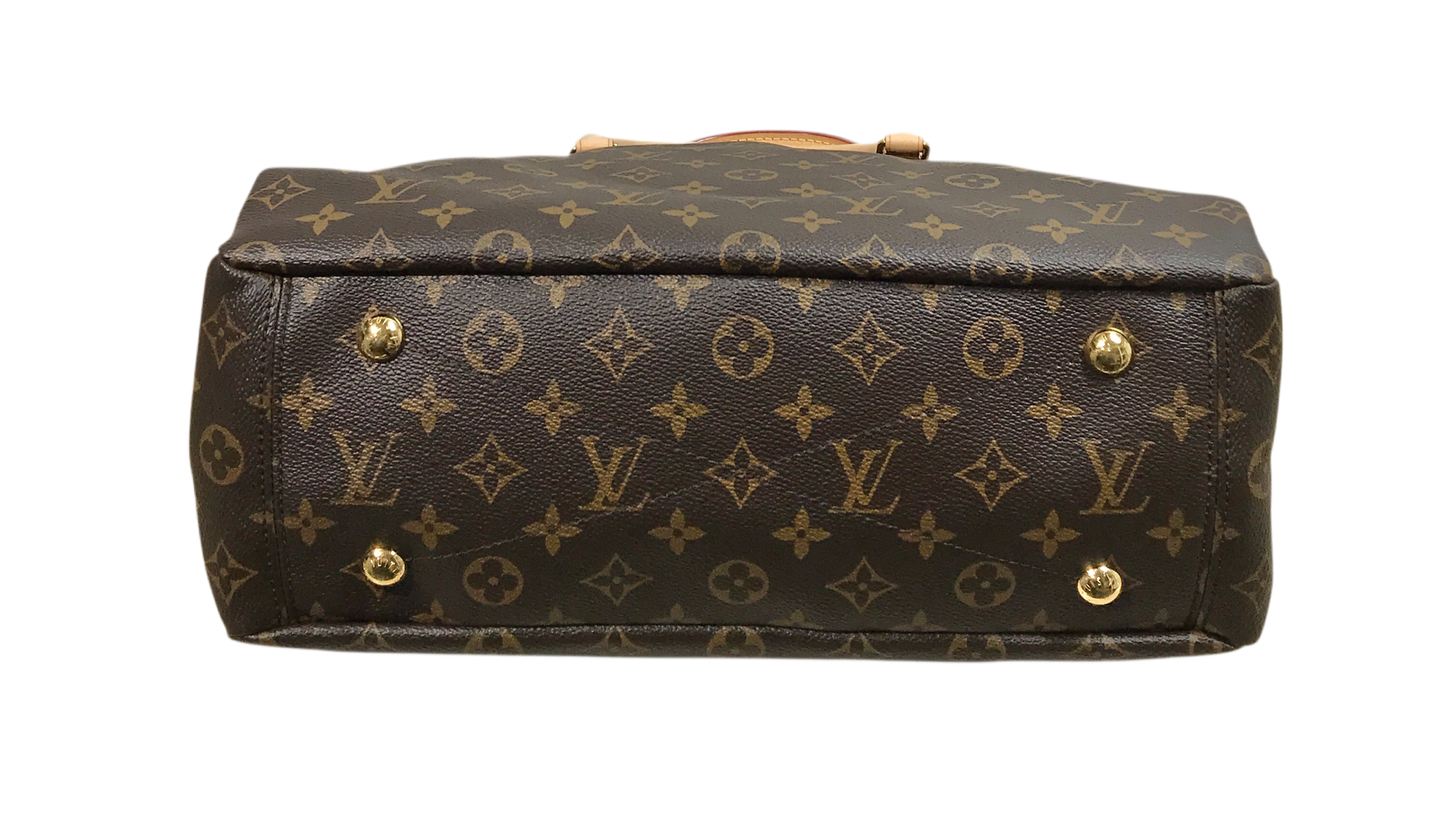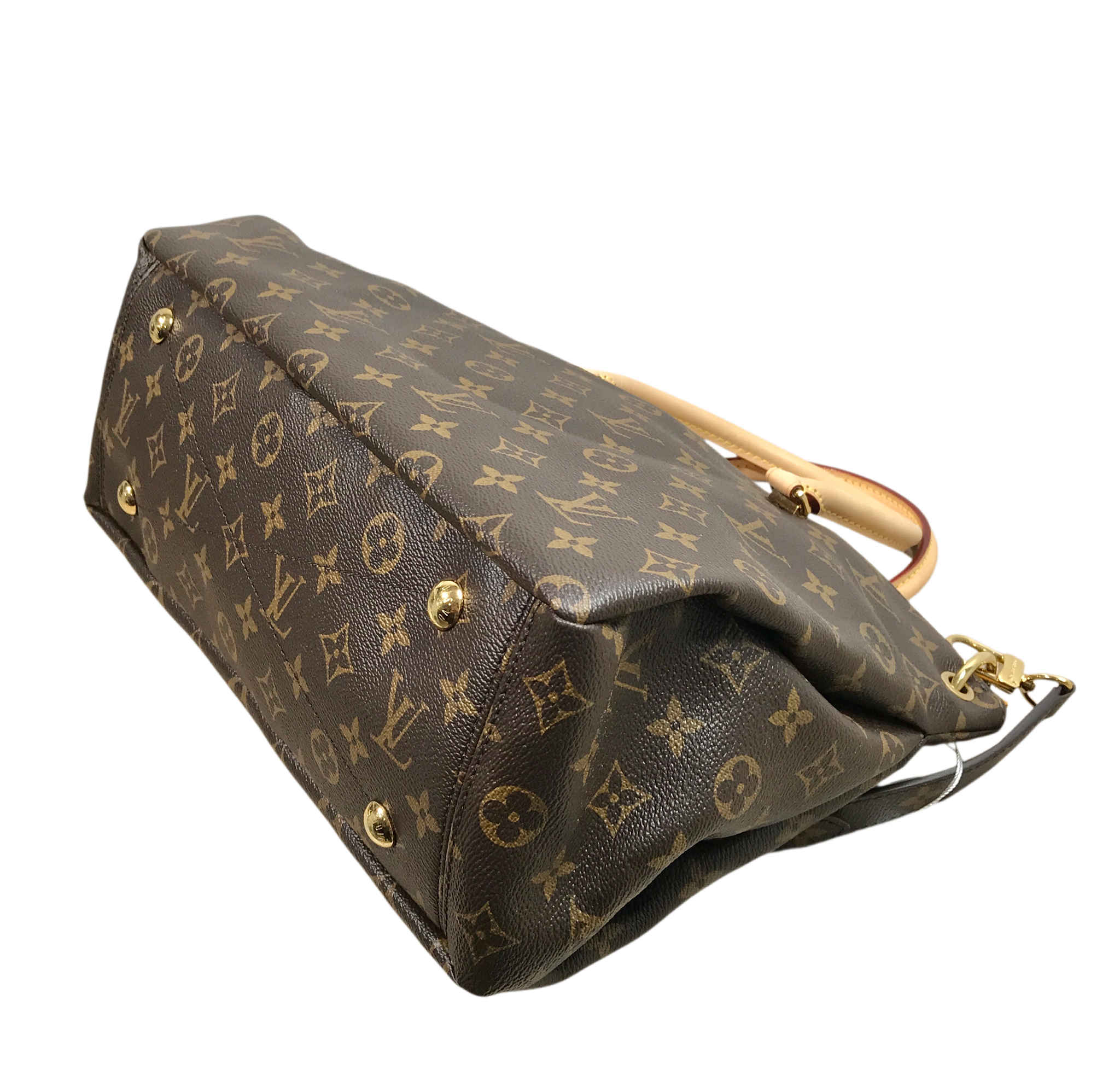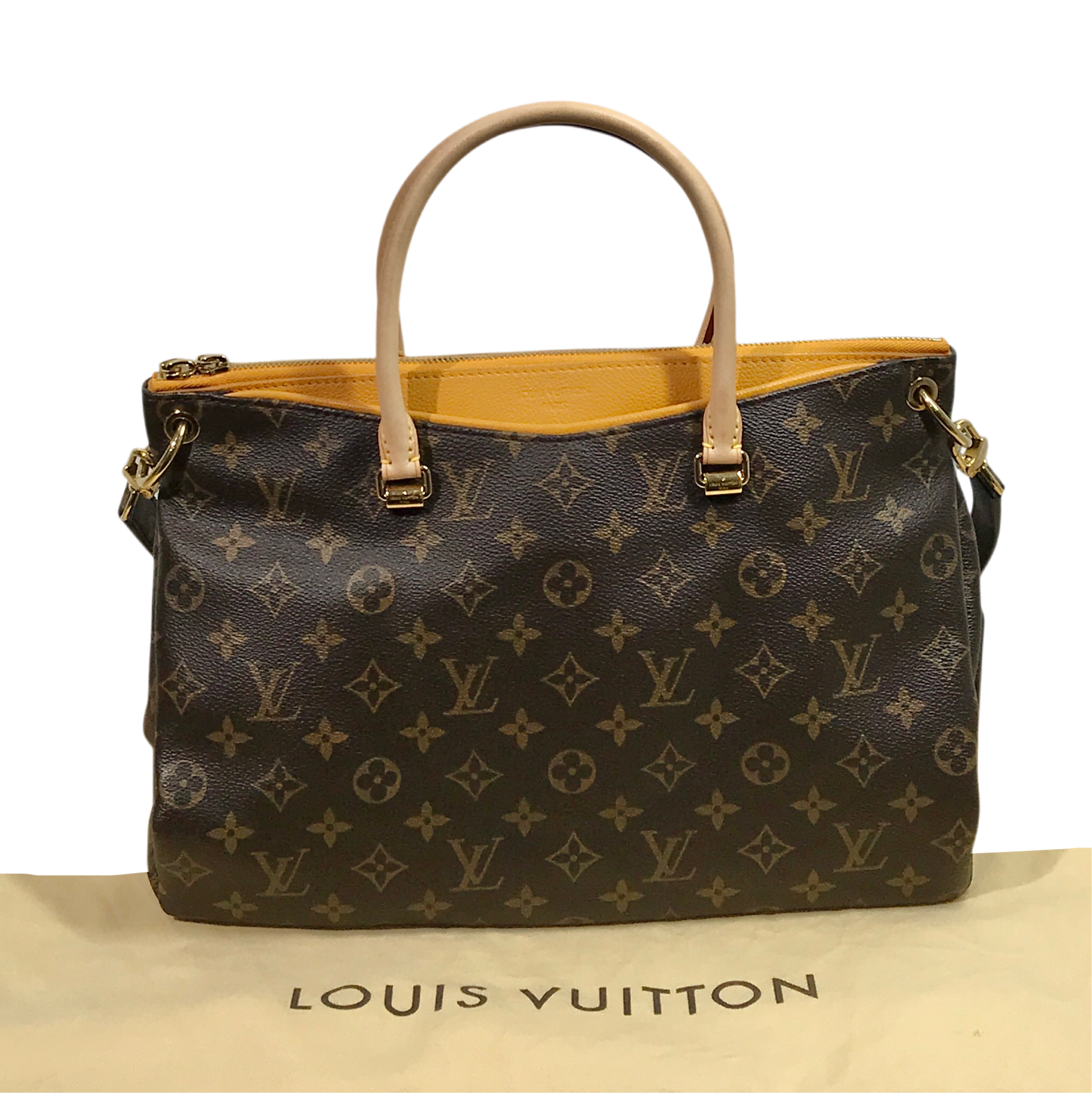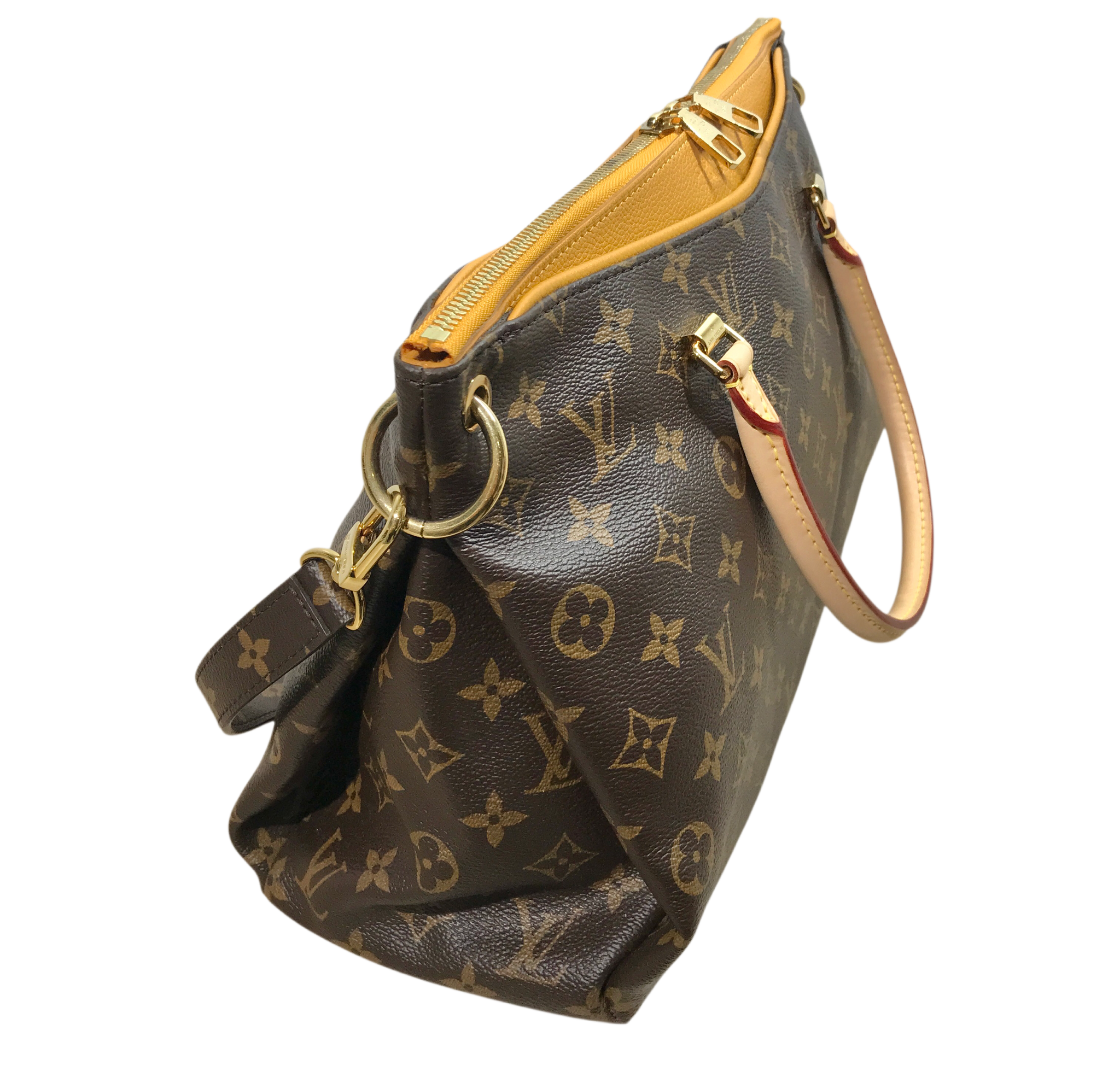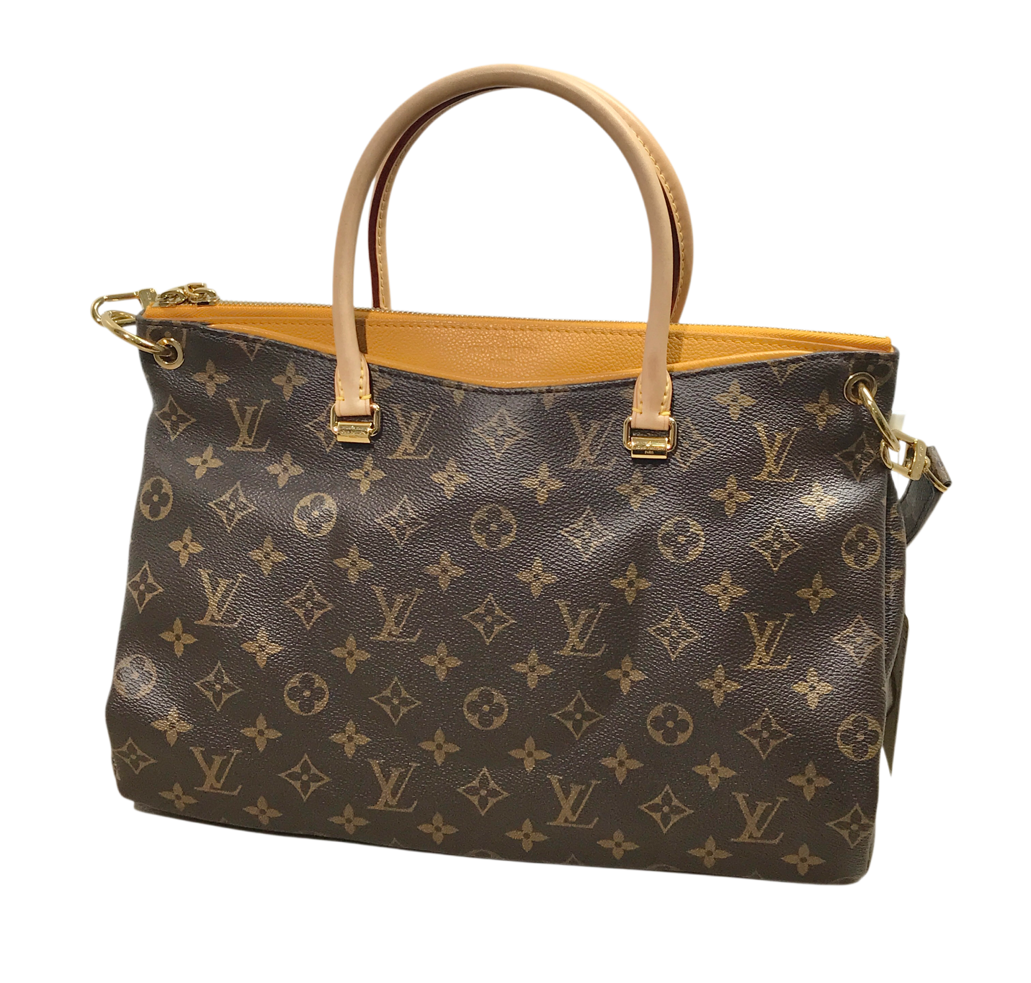 Vachetta leather rolled top handles, deep pockets on the front and back, zip closure, yellow microfiber lining, three interior patch pockets, detachable monogram canvas strap